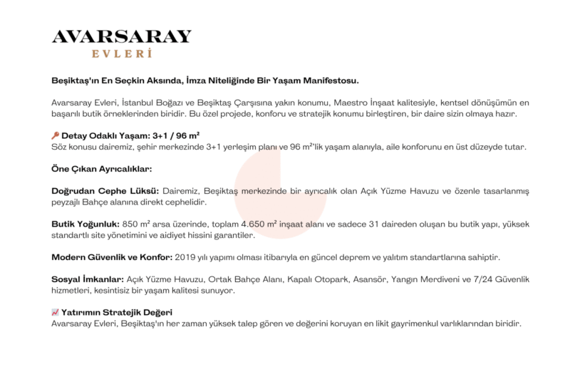 Avarsaray Evleri, İstanbul Boğazı ve Beşiktaş Çarşısına yakın konumu, Maestro İnşaat kalitesiyle, kentsel dönüşümün en başarılı butik örneklerinden biridir. Bu özel projede, konforu ve stratejik konumu birleştiren, bir daire sizin olmaya hazır.